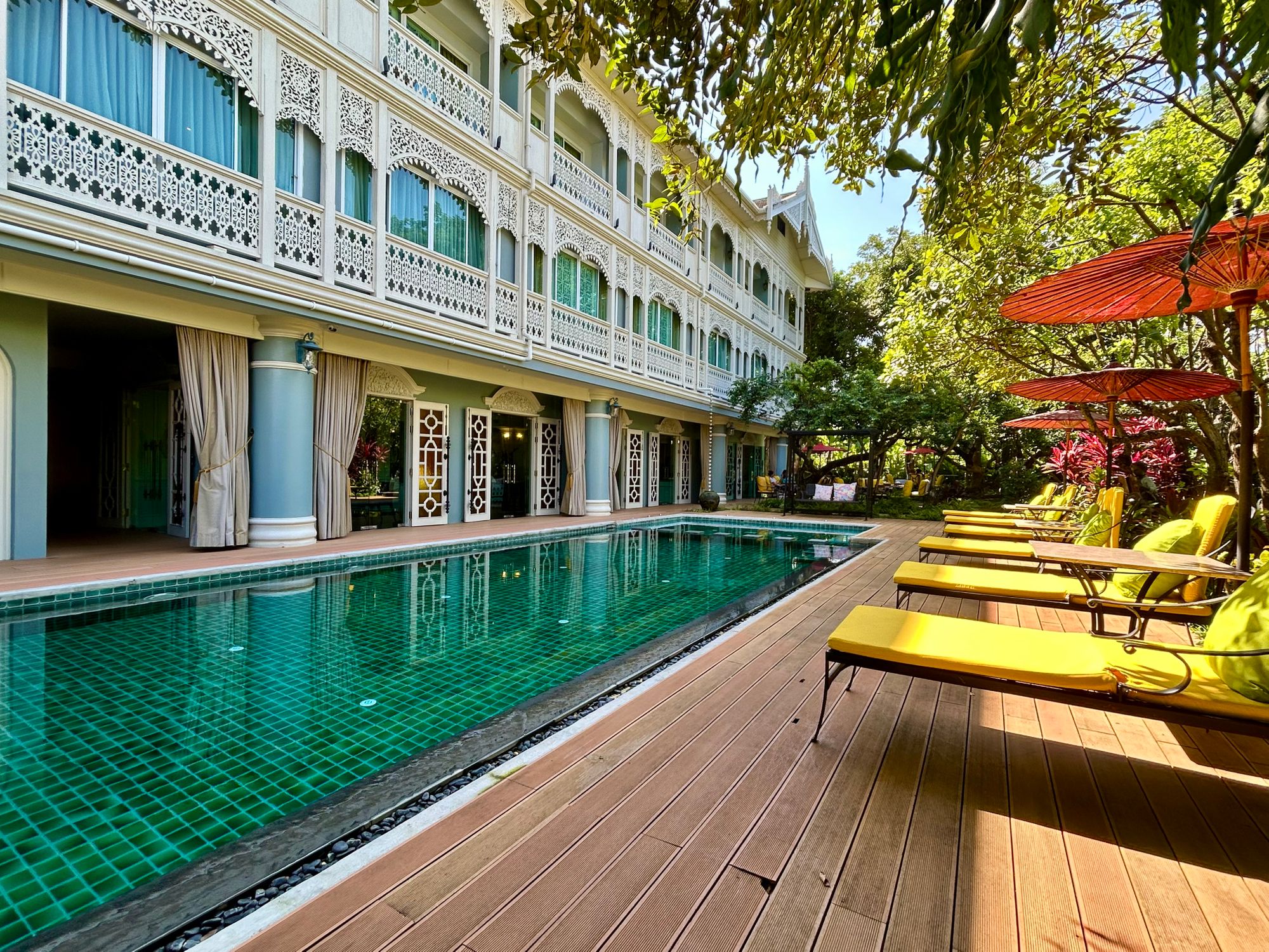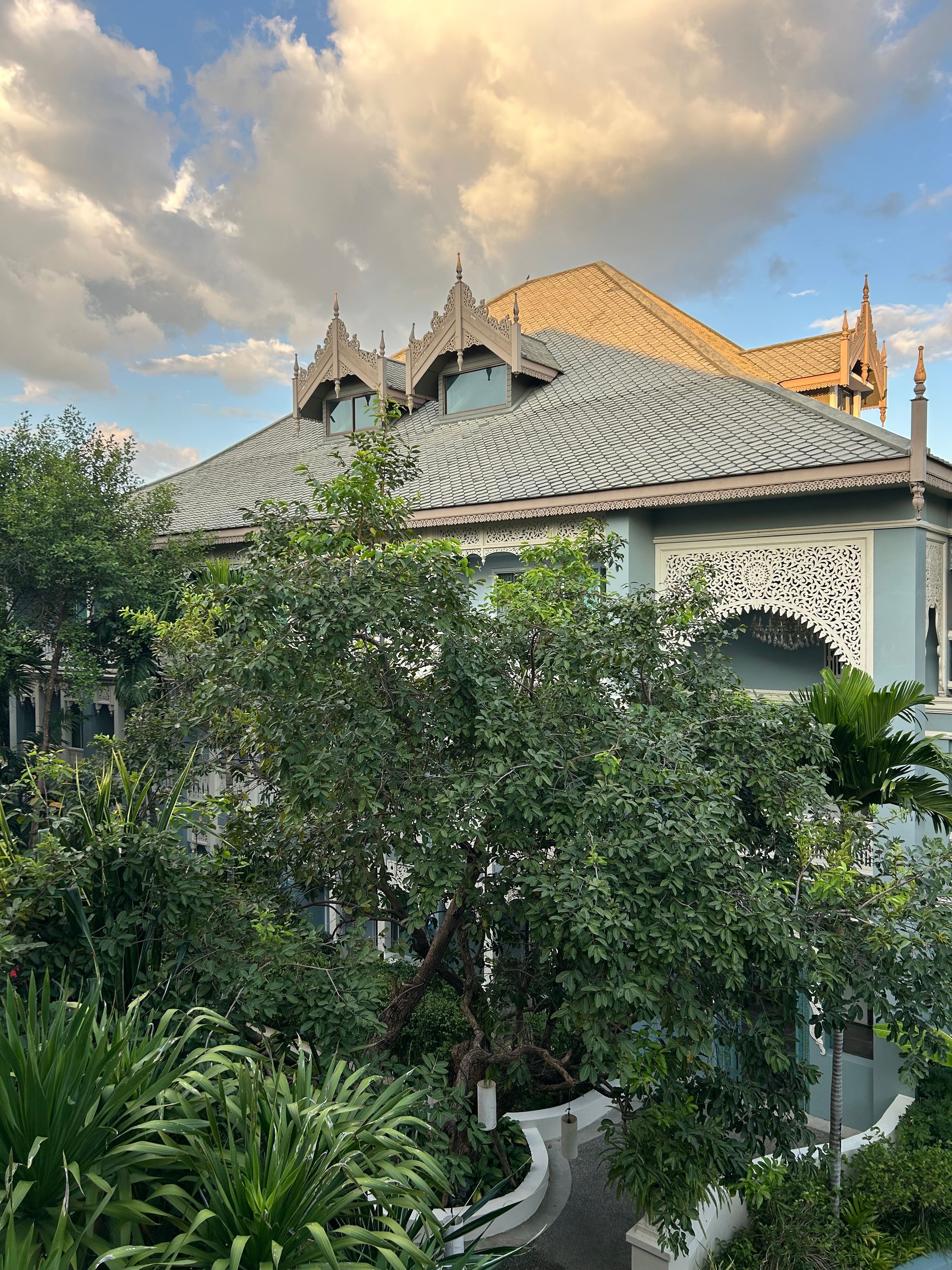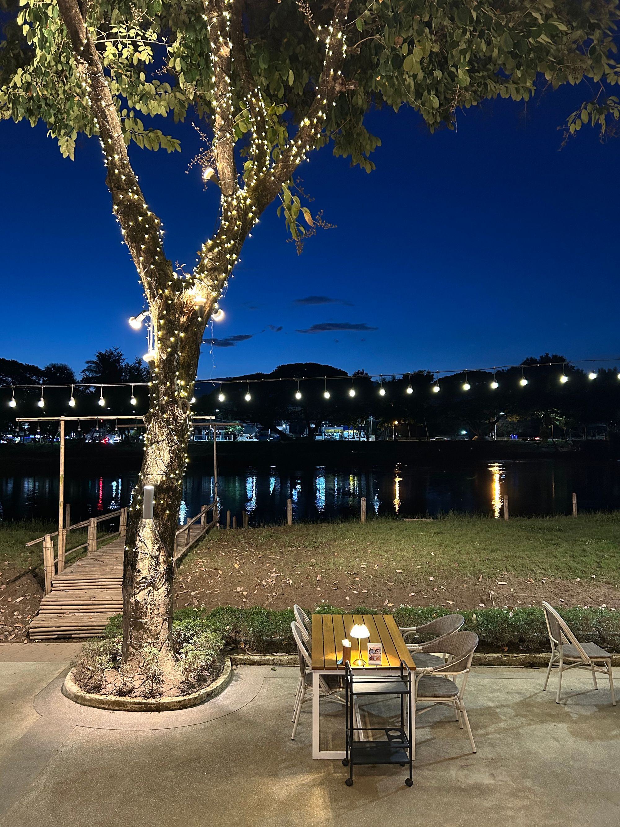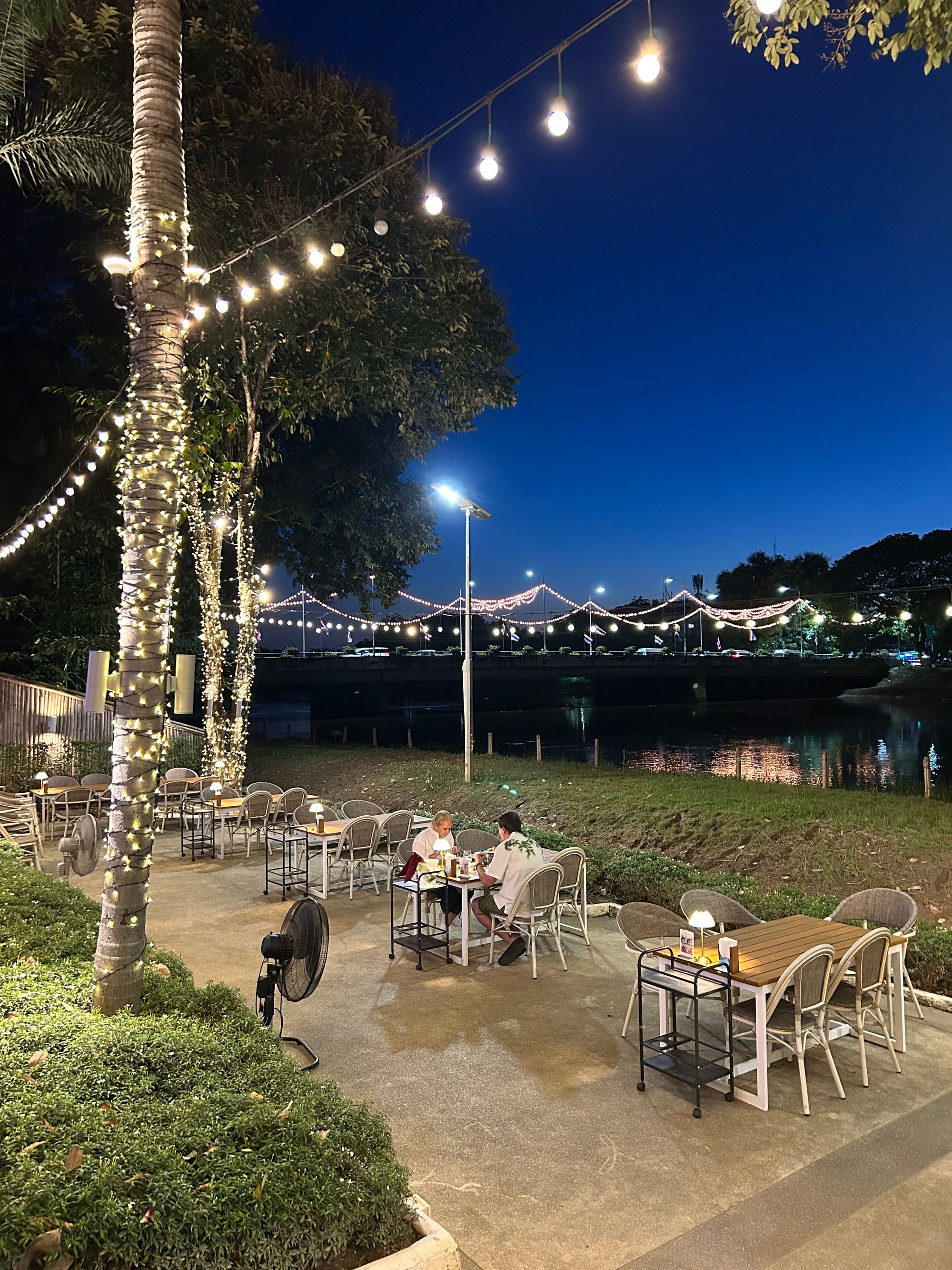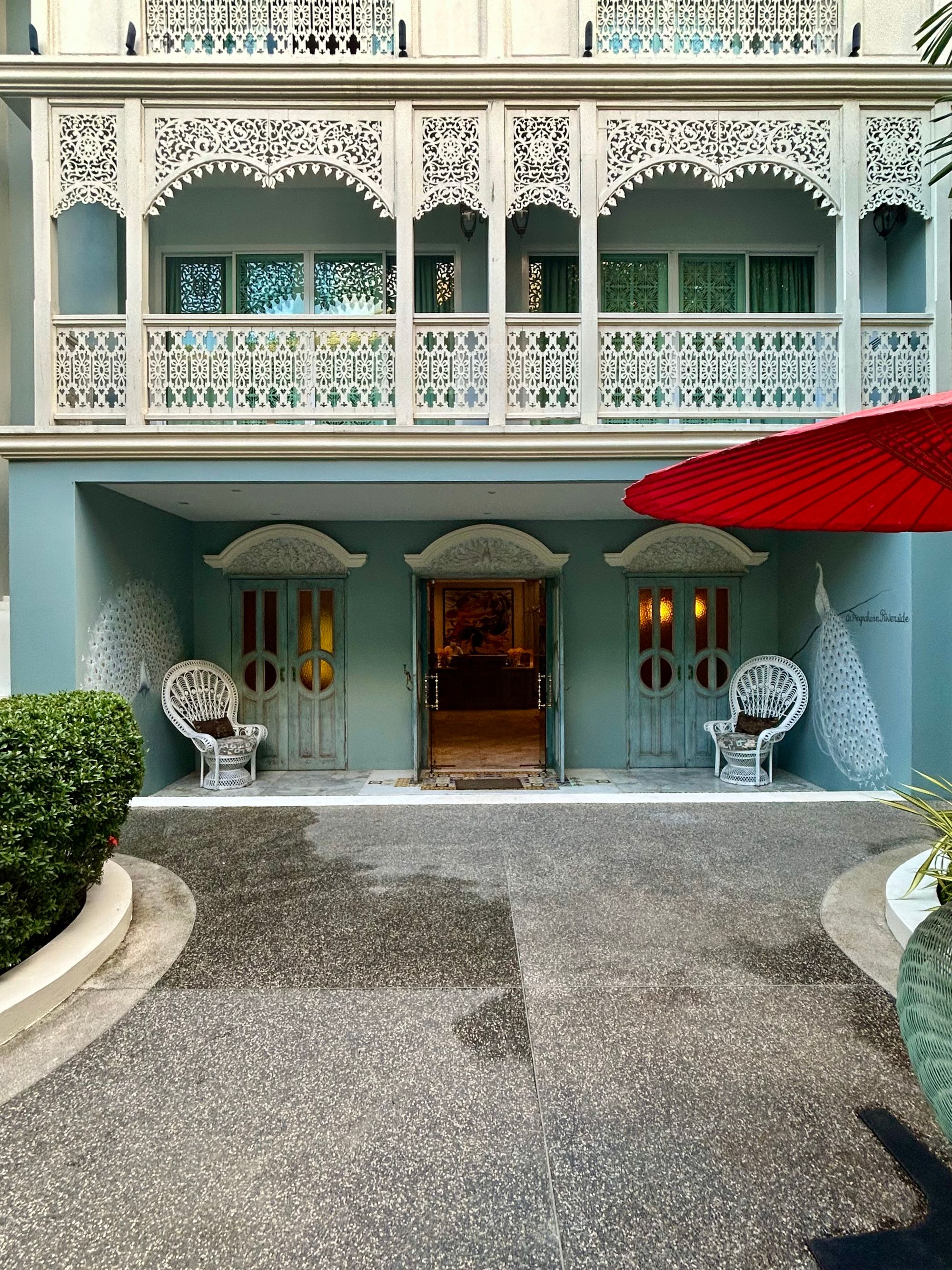 Let je minil hitro, na letališču imajo več stojnic, kjer popotnikom, glede na destinacijo, preračunajo strošek taksija, ki je nas odpeljal do nastanitve ob reki Ping, imenovani At Pingakorn Riverside Hotel https://www.atpingnakornriverside.com/. Povabljiva, čeprav nekoliko umetelna zunanjost se težko kosa z notranjostjo hotela, kjer se srečajo vsi stili od XIV. stoletja do danes. Navkljub sobi, ki smo jo rezervirali po izjemno ugodni ceni (late escape deal na platformi booking), so nas prijazno namestili v največjo suito, z dvema spalnicama, kopalnicama in čudovitim balkonom. Po sobi smo se nemudoma razlezli kot kuga in se zadovoljni odpravili na večerjo v bližnjo Riverfront Restaurant Chiang Mai https://www.riverfrontchiangmai.com/.
