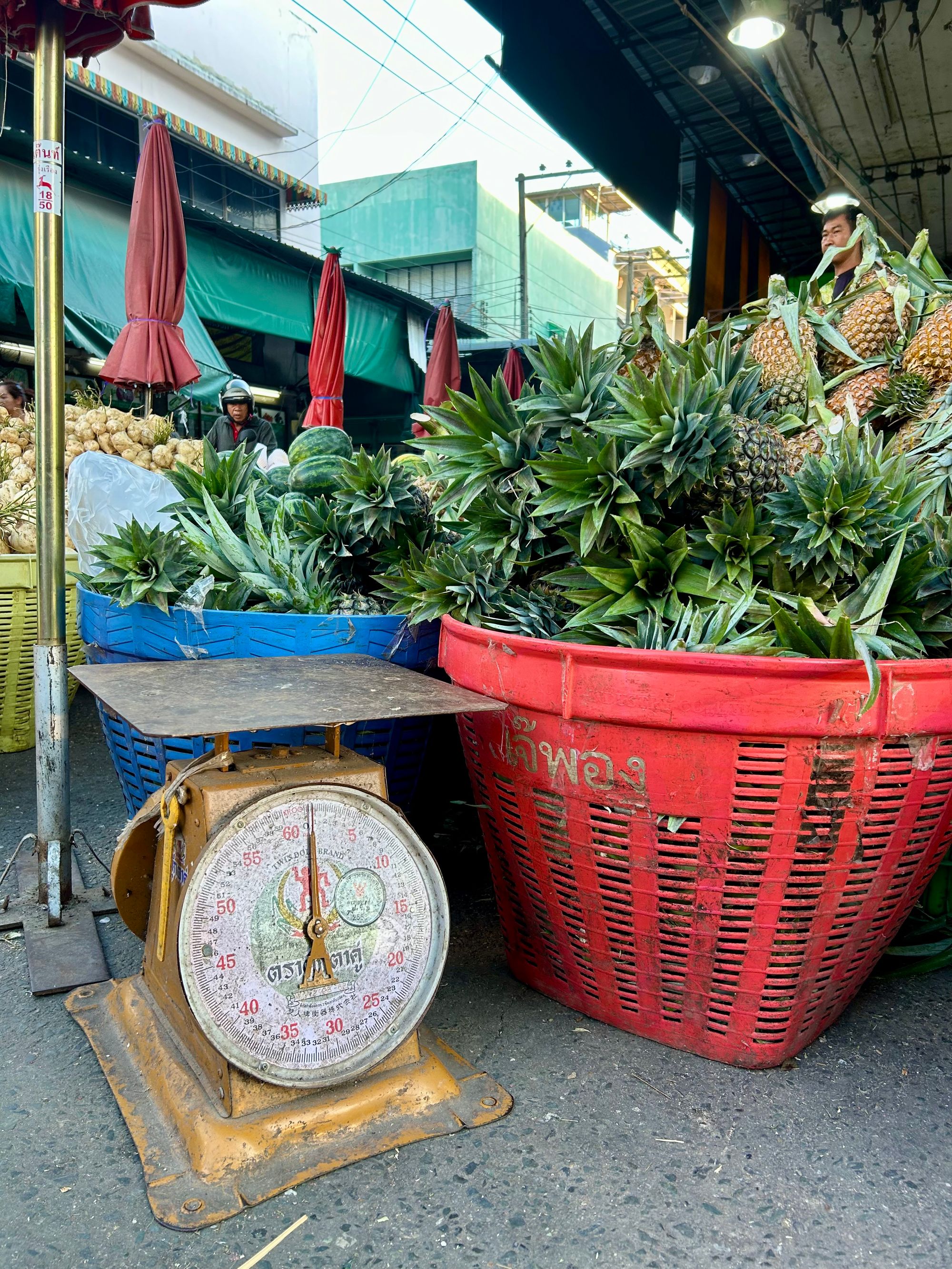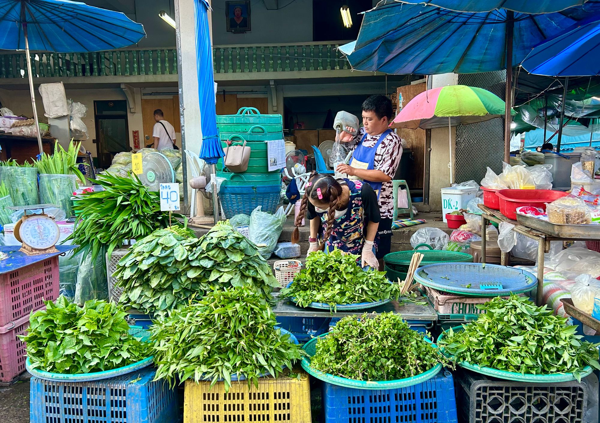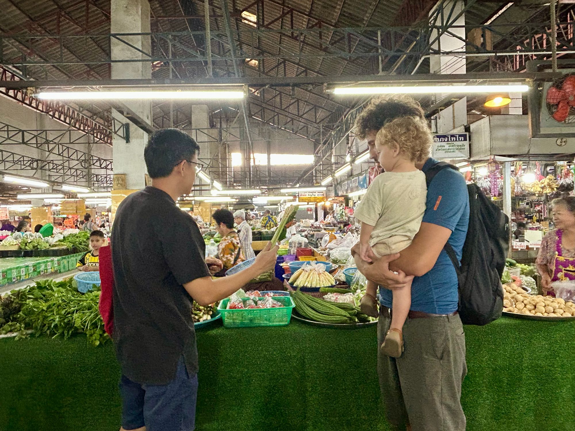 Jutra smo praviloma preživljali med počasnimi zajtrki na terasi s pogledom na reko, igranju in kopanju v hotelskem bazenu. Po počitku smo sobotno popoldne izkoristili in se sprehodili v center mesta. Pot nas je naključno vodila mimo tržnice s sadjem Muang Mai Market https://lannalife264520817.wordpress.com/2019/10/30/kad-muang-mai-muang-mai-market/, z odličnim in noro poceni sadjem. Navdušenje nad sladkim mangom, ananasom, kokosom, mangosteenom, longanom nikoli ne gre iz mode in s pridom fanta polniva z vitamini vsakič, ko naletimo na priložnost.