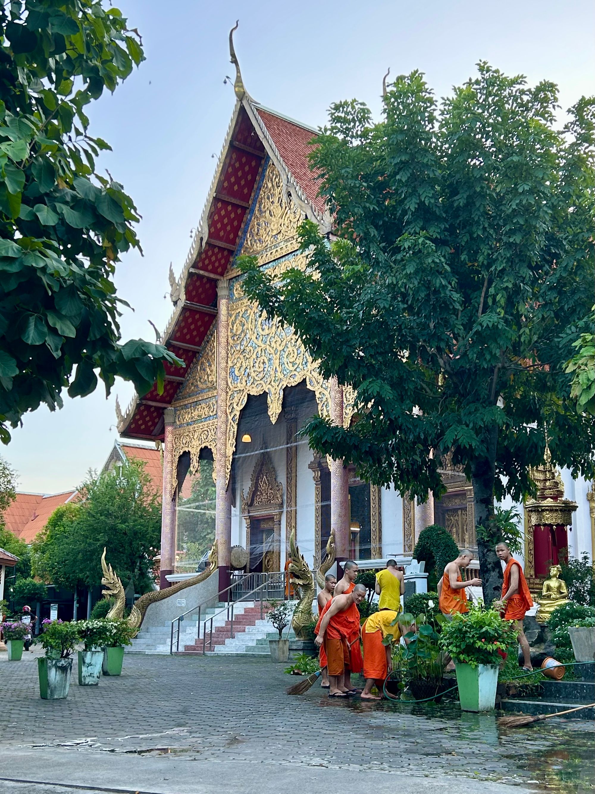 Sprehodili smo se ob čudovitem templju vrednem ogleda Wat Chai Sri Poom, kjer smo naleteli na delovno akcijo menihov, tempelj pa se nahaja ob vstopu v staro mestno jedro. Slednje je obdano s starodavnim obzidjem in obrambnim jarkom, prvotno zgrajenem v 13. stoletju. Čeprav je velik del prvotnega obzidja v ruševinah, so ostanki še vedno vidni, območje pa zaznamujejo štiri glavna vrata: Tha Phae, Suan Dok, Chiang Mai in Chang Phuak. Staro mestno jedro velja za kulturno in turistično središče Chiang Maija, polno templjev, tržnic in zgodovinskih znamenitosti.