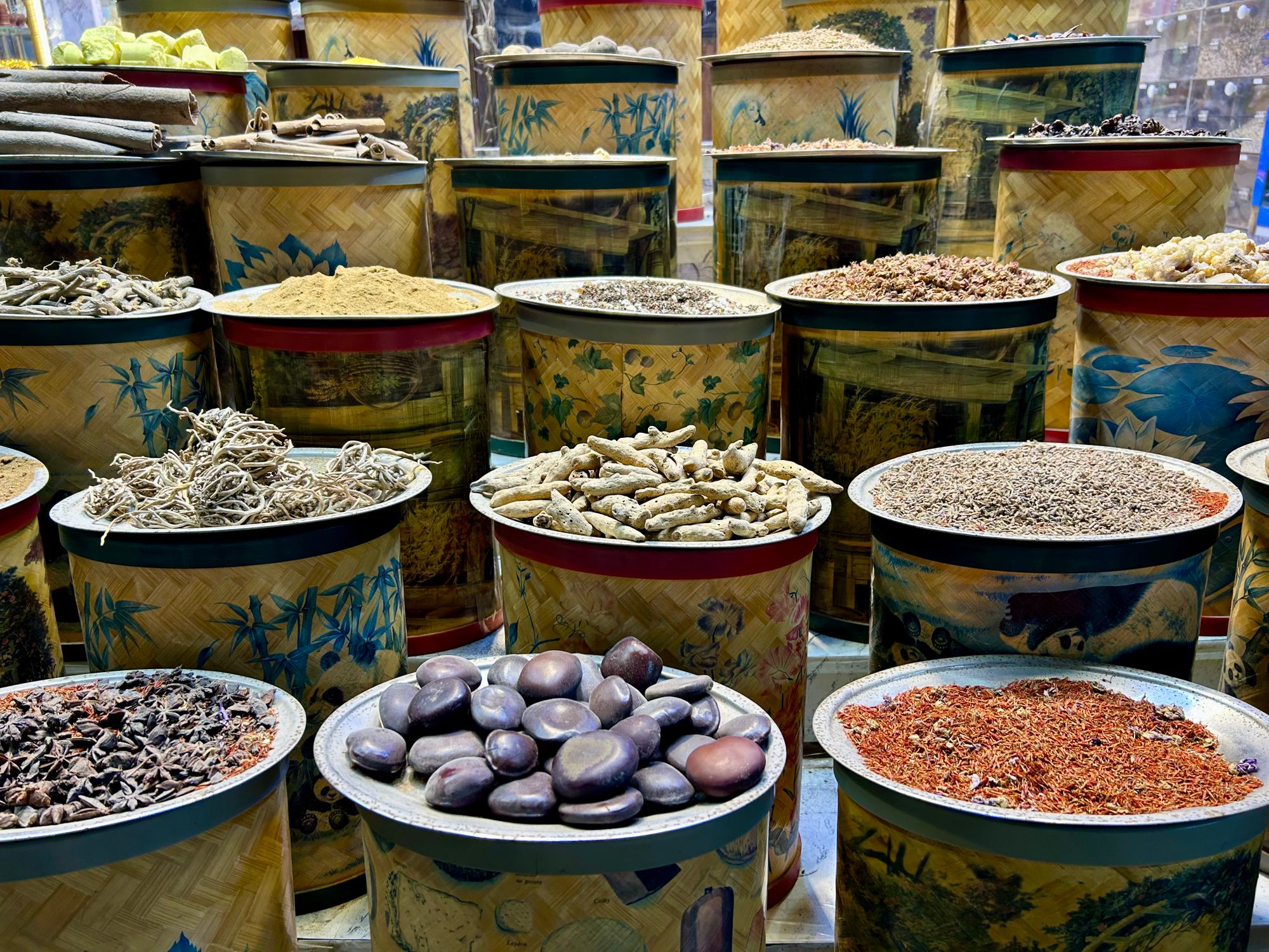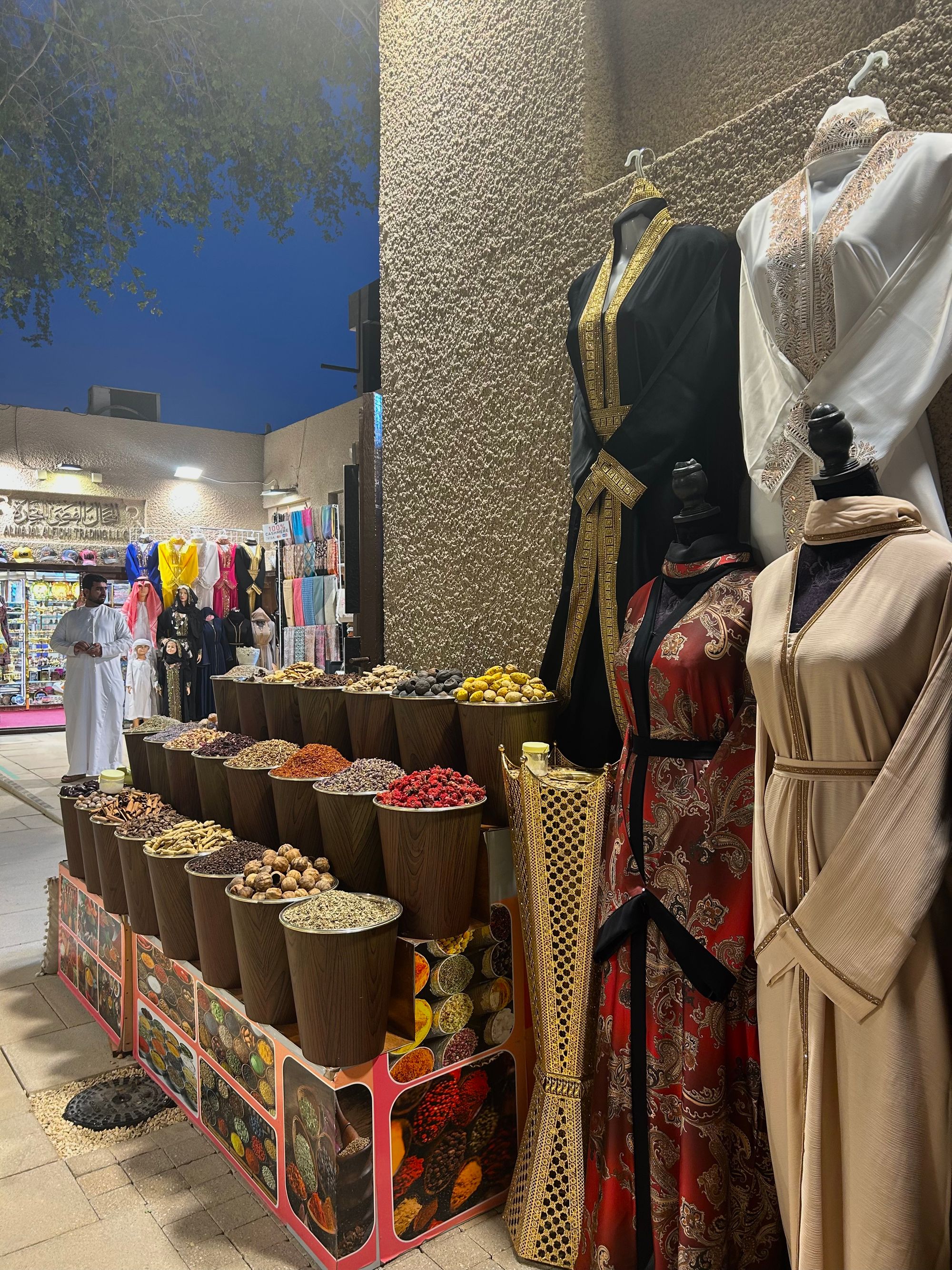 Popoldne sva rezervirala vodeni sprehod po starem mestnem jedru in tržnicah zlata ter začimb: https://www.getyourguide.com/en-gb/dubai-l173/dubai-old-town-souks-street-food-guided-tour-abra-ride-t303828/?ranking_uuid=e684319d-a3e3-40fd-97ed-1ed5fbddb738&closeTabOnNavigationBack=true. Prvi postanek je bil v traducionalni restavraciji Al Khayma Heritage Restaurant https://alkhayma.com/restaurant/al-khayma-heritage-restaurant-dubai, ki ponuja bogato izkušnjo emiratske kulture in kulinarike. Nam so ponudili datlje in kavo s kardamomom ter žafranom. V Dubaju se restavracija nahaja v zgodovinski soseski Al Fahidi, zaradi česar je del lokalne kulturne dediščine. Dubajska podružnica je prepoznana tudi v Michelinskem vodniku. Sprehod nas je vodil do Al Fahidi predela https://www.visitdubai.com/en/places-to-visit/al-fahidi-historical-neighbourhood, kjer je na voljo več kot 50 "hiš". Ogled se običajno začne v Centru za kulturno razumevanje šejka Mohameda bin Rashida Al Maktouma (SMCCU), ki ponuja kulturno poglobljen ogled okrožja. Med drugimi zanimivostmi sta tudi Simpozijska hiša in Hiša dogodkov, kjer pogosto potekajo kulturni dogodki in dejavnosti ter občinska hiša, ki je izjemen primer tradicionalne dubajske arhitekture. Hiše so bile v preteklosti grajene iz koral, kot vezivo pa so uporabljali kamelje mleko.